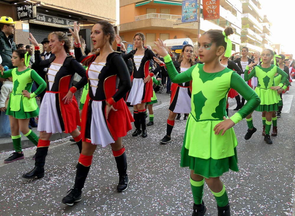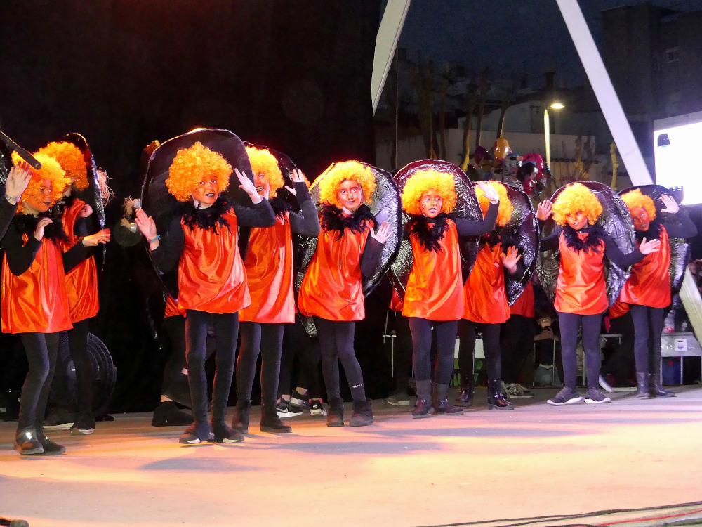 Un total de 9 comparses van desfilar diumenge a la tarda en la rua de comparses de Carnaval que va recórrer la Gran Via de Lluís Companys entre les places de Joan Corominas i dels Països Catalans.
